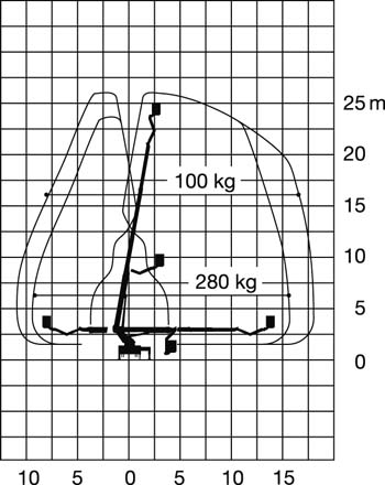 | Maximale Arbeitshöhe: 26,00 m Antriebsart: Diesel Abmessungen (L x B x min. H): 8,20 x 2,50 x 3,25 m Abstützung: einseitig: 3,45 m beidseitig: 4,45 m Kontur: 2,47 m Führerscheinklasse alt: 3 neu: C1 Zulässiges Gesamtgewicht: 7.490 kg Schwenkbereich 500 ° Maximale Tragfähigkeit im Korb: 280 kg Abmessungen des Korbes (L x B): 0,80 x 1,60 m Ausstattung: Drehbarer Arbeitskorb 2 x 50° Korbarm Anschluss im Korb: 230 V Fahrerhausdachschutz Sonderausstattung auf Anfrage: Baumtrenngitter |